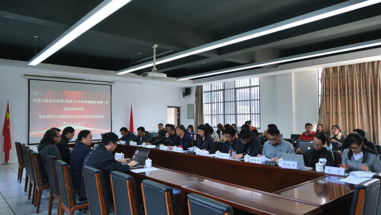 3月11日下午,传媒学院部校共建“融媒体仿真实验室”落实推进会在明德3号楼会议室召开,云南报业传媒(集团)公司李阳喜副总经理一行5人到会指导。校党委副书记李宏,资产处、基建处、网络与信息中心等部门负责人以及传媒学院领导班子、学院专业负责人、系主任和其他骨干教师参加了会议。会议由传媒学院院长魏红主持。