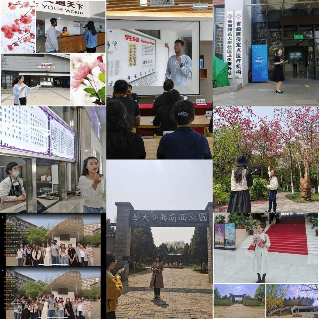 “云游师大”活动伊始,留学生拉希德“变身”主播带着大家一同前往观光学院办公室、教室、文化长廊等,学院老师们纷纷向留学生问好,希望大家可以早日返校。第二站,许嘉杰带领大家前往西南联大仿制门,感受云师大浓厚的历史韵味;第三站,李青云带领大家来到8858cc永利唯一官方网一号门,讲述了大门的设计内涵;第四站,泰国留学生张美孝带大家参观了黑天鹅畅游的南湖、北潭;第五站,苏馨蕊带领大家畅游云师图书馆,了解图书馆丰富的馆藏文献;第六站,蒋丹用镜头带大家到食堂,感受特色美食“诱惑”。拉希德还带大家“云游”留学生宿舍,留学生们的思绪也仿佛回到往日校园生活。活动接近尾声,蒋丹、拉希德带领大家来到贝壳广场,采访了来往的中国学生。最后,主播们齐聚一堂,向留学生致以美好的问候,此次活动在大家对留学生返校的期待中圆满结束。