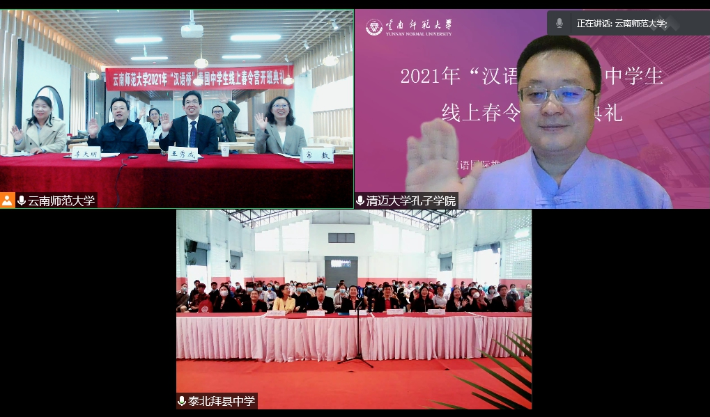 为进一步做好中文国际推广与中外人文交流工作,延续“汉语桥”项目热度,永利官网国际汉语教育学院承办了国家中外语言交流合作中心2021“汉语桥”泰国中学生线上春令营项目。4月4日上午,春令营开班典礼以“云连线、云直播”的方式,在永利官网呈贡主校区同析2号楼茶艺教室、泰国清迈地区拜县中学大礼堂和清迈大学孔子学院会议室三地同时举办。国际汉语教育学院院长王秀成、党委副书记常数、副院长李天明,泰国清迈地区拜县中学副校长金达女士,清迈大学孔子学院中方院长沈毅等领导出席,8858cc永利唯一官方网汉语国际推广师资培训基地(昆明)全体工作人员、拜县中学教师代表以及122名春令营营员学生参加,开班典礼由李天明副院长主持。