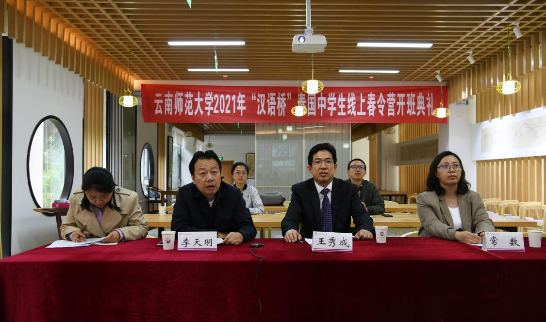 国际汉语教育学院王秀成院长致欢迎辞,他指出自新冠肺炎疫情爆发以来,各国各地区迫不得已暂时封闭,但国与国的联系不会一直中断下去,因为在这个时代,整个世界已越来越成为你中有我、我中有你的命运共同体,所以今天中泰双方通过网络,以“相聚云端”的方式举办这次活动。这是国际汉语教育学院首次以线上方式举办“汉语桥”外国中学生春令营,项目为期7天,整合学院20位专职教师,共开设汉语课、文化课、专题讲座等十余门课程,还融入了云南著名名胜古迹文化区实景拍摄等内容,预计课程直播时长超1680分钟,课程录播时长超230分钟,希望外国中学生能在“云学习,云体验”中身临其境,学有所获。