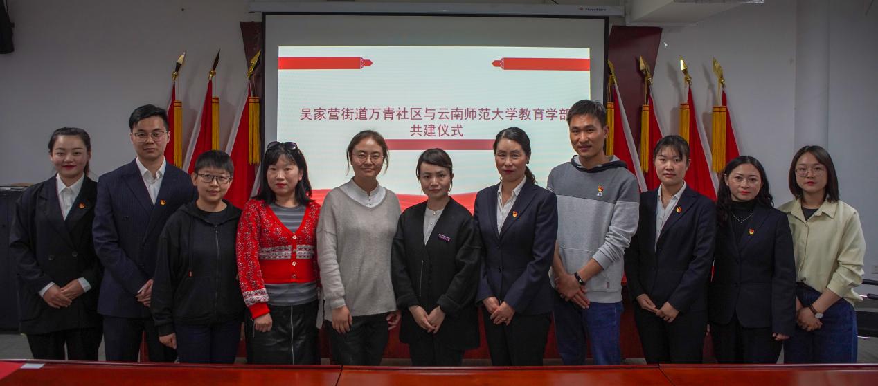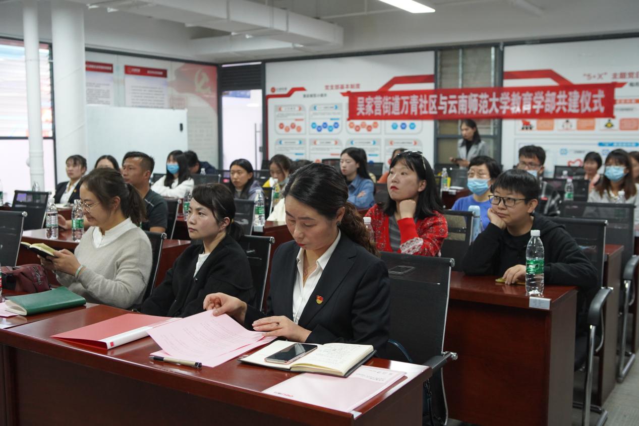 4月8日下午,永利官网教育学部与呈贡万青社区实践教学基地、支部共建签约授牌仪式在呈贡区仕林街9栋举行。教育学部副主任马谐、心理系系主任闫志英、学前教育系系主任李林曦、研究生第三党支部书记刘照、吴家营街道党工委委员蒋浩全、万青社区党支部书记兼居委会主任杨丽花、社区副主任杨洁以及居民志愿者代表、大学生志愿者代表参加了签约仪式。仪式由万青社区党支部书记杨丽花主持。