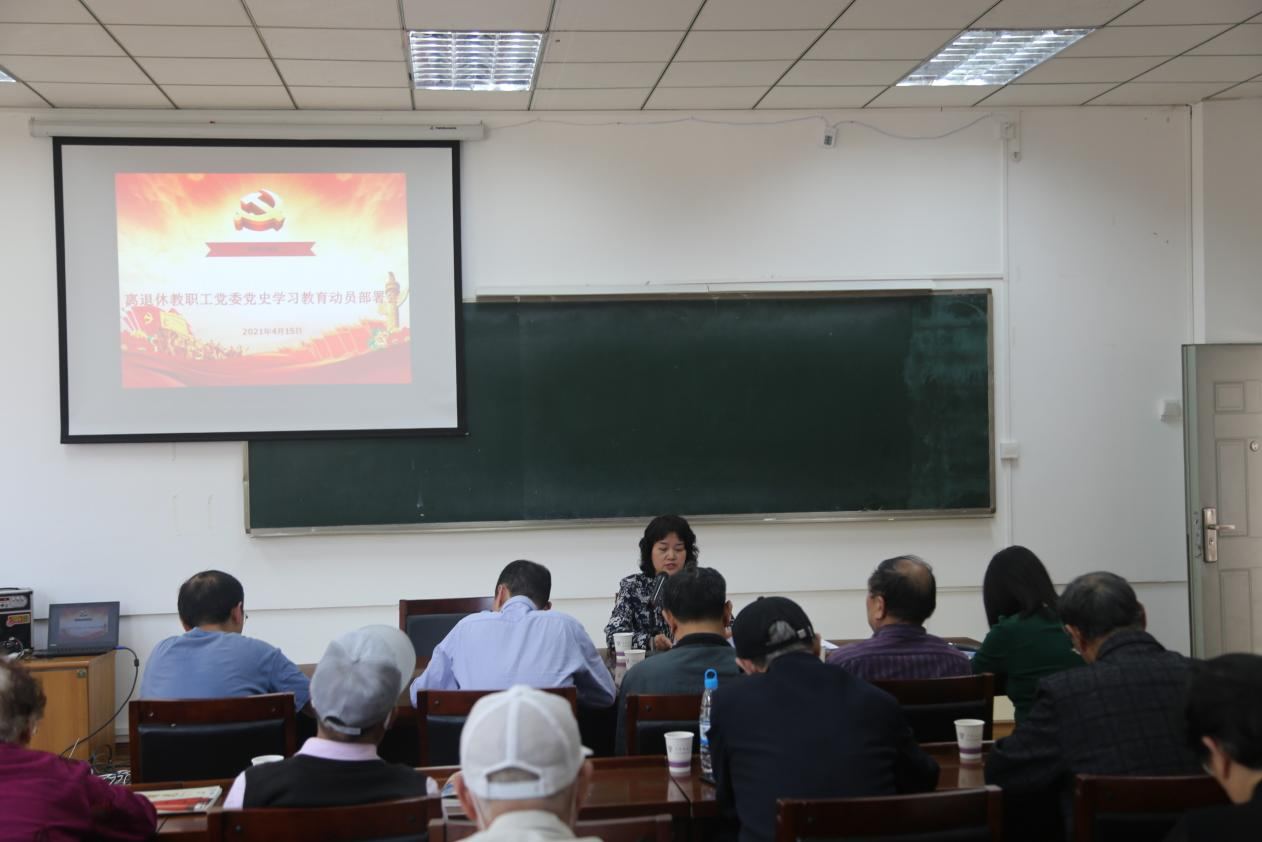 离退休教职工党委书记王琼玲作了动员讲话,从准确把握党史学习教育的目标要求、重点,高标准高质量完成党史学习教育各项任务提出了要求,并进行了工作安排部署。