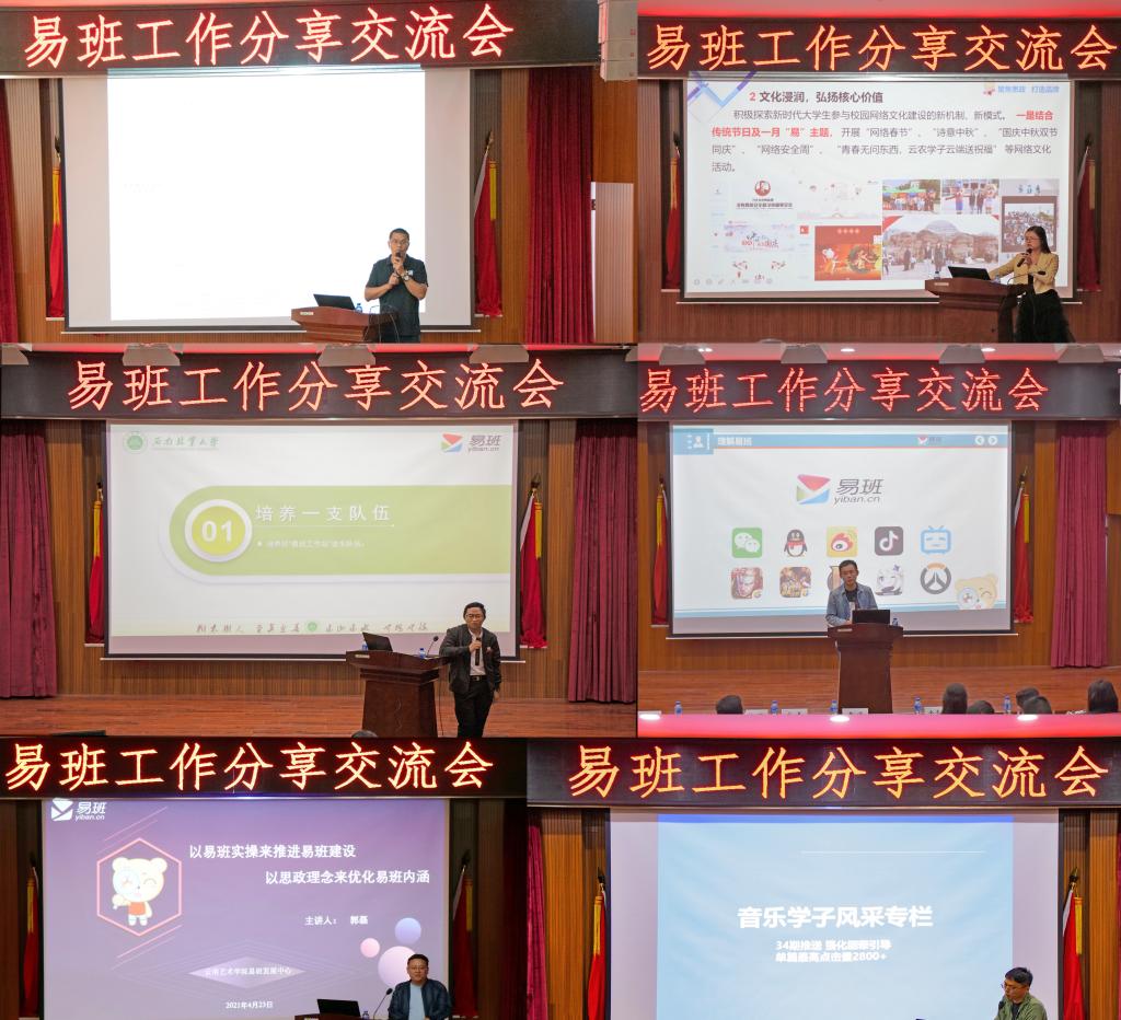 各高校老师分享了易班工作经验及建设过程中的思考,昆明理工大学的高磊老师以“共建共享,互联互通全面实施易班推广行动计划”为主题进行了分享,他提出要全面推广易班工作,使易班成为真正的网络思想政治工作主阵地。西南林业大学林朋老师以“高校易班建设与校园文化活动的融合发展”为题,提出易班建设要与校园活动相融合,互通共进、汇融发展。云南艺术学院丁国起老师以“二级学院如何利用易班网增强学生工作时代感和吸引力”为主题进行分享交流,提出易班要在二级学院中广泛推广,不断推进易班在学生工作中的影响力。云南艺术学院郭磊老师以“以易班实操来推进易班建设,以思政理念来优化一般内涵”为主题进行分享交流,讲述推进易班建设发展不仅仅要靠想,而是要通过实操,用思政理念来建设。云南农业大学余亭蓉老师以“聚焦思政,主动‘破圈’”为主题,提出高校易班要用网络思政来进行实践育人,构建网络育人的新格局。最后,云南艺术学院黄涛老师以“对易班建设工作的认知和反思”进行分享总结,易班的建设发展任重道远,永利官网要积极学习其他高校易班建设的宝贵经验,利用好网络思政教育的利器,不断完善和发展易班平台。