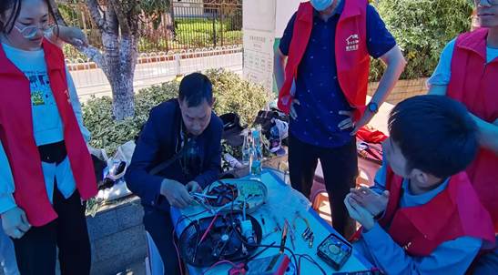 学院梦创电子协会指导教师周绍红作为技术顾问到场指导学生解决电器维修中出现的疑难问题,并进行现场教学维修演示,为学生上了一堂生动的电器维修实践课。
