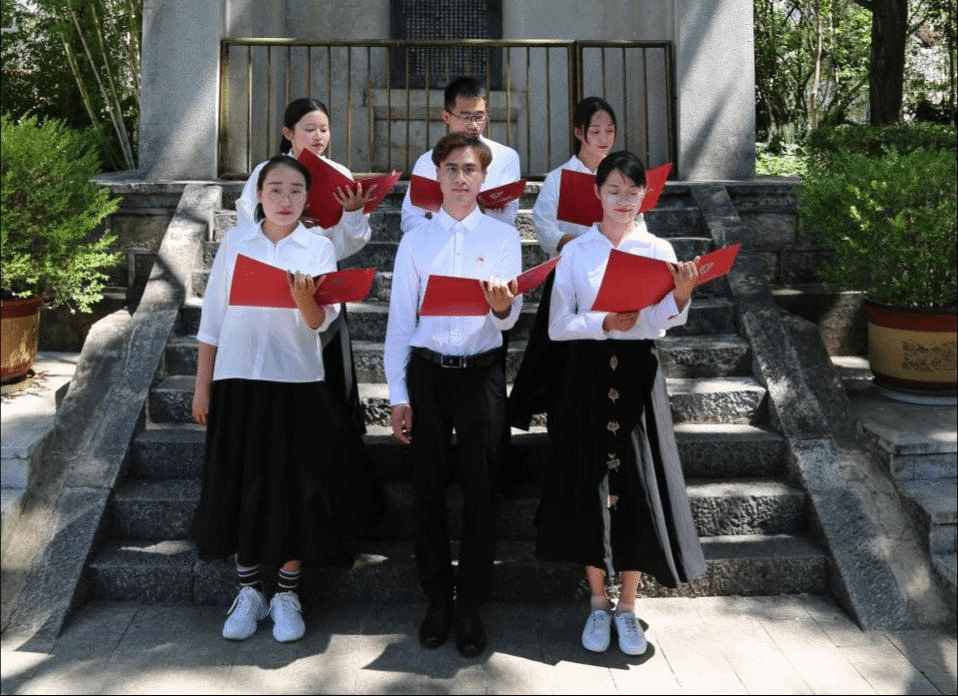 5月22日上午,参加此次学习体验主题党日活动的全体同志在呈贡校区明德三号楼前面对党旗重温入党誓词。