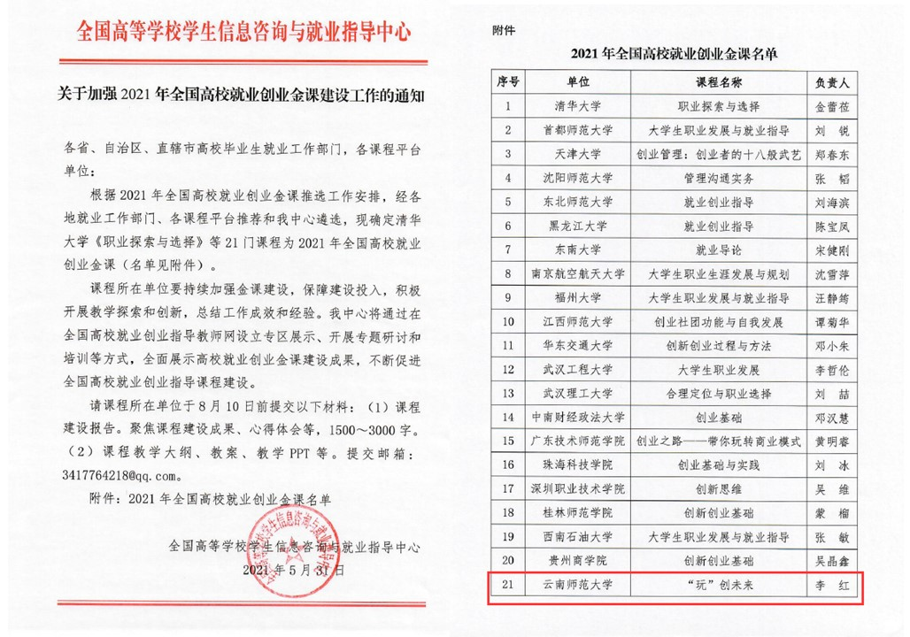 日前,全国高等学校信息咨询与就业指导中心公布了2021年全国高校就业创业金课建设名单,永利官网就业处处长、创新创业学院办公室主任李红教授负责的线上课程《“玩”创未来》获评全国高校就业创业金课。