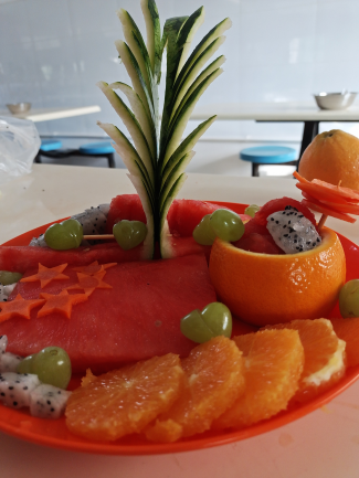 本次比赛的创作内容围绕庆祝建党100周年、节约粮食、珍惜劳动成果展开,创作要求为节约、创新、美观、有意义,同学们利用水果刀、牙签等工具雕刻、摆盘,创造出造型多样、寓意丰富的水果拼盘作品。比赛共评选出一等奖1组,二等奖2组,三等奖4组。