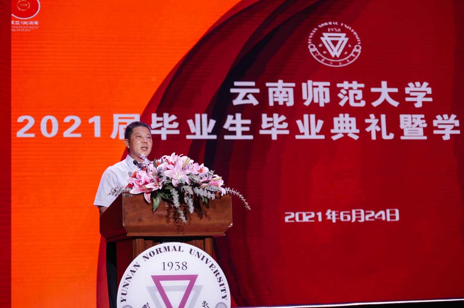 最后,校党委饶卫书记深情寄语毕业生:时代是我们人生最大的际遇,希望同学们在新时代乘势而上、乘风破浪,始终保持积极向上的阳光心态,勇敢面对顺境和逆境,深刻理解把握时代潮流和国家需要,一棒接一棒、跑出好成绩,书写不懈奋斗的人生华章;社会是我们人生最大的课堂,希望同学们把实践当作终身学习的老师。既要学会读有字之书,更要多读无字之书,胸怀更广阔的天地,扎根人民、深入基层,甘为人梯、献身教育,以聪明才智贡献国家,以开拓进取服务社会;党和祖国是我们人生最大的依托,希望同学们不忘从党史学习中激发信仰、获得启发、汲取力量,始终坚持把自己的理想同祖国的前途、民族的命运紧紧联系在一起,立大志、明大德、成大才、担大任,让青春在为祖国、为民族、为人民的不懈奋斗中绽放绚丽之花。