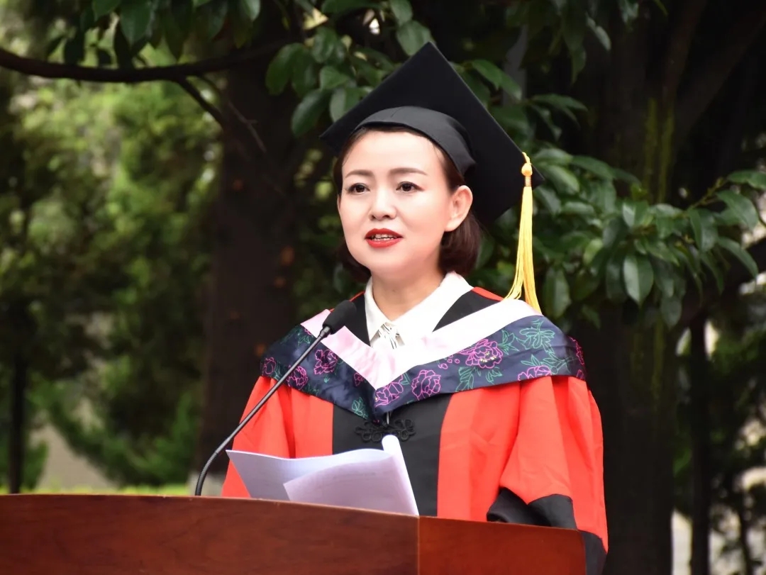 旅游管理系主任桑彬彬老师作为教师代表发言,回顾了陪伴同学们从稚气未脱到睿智成熟的成长历程,希望同学们能一如既往地关注母校的发展,坚持梦想,坚持学习,主动作为,不断提高。