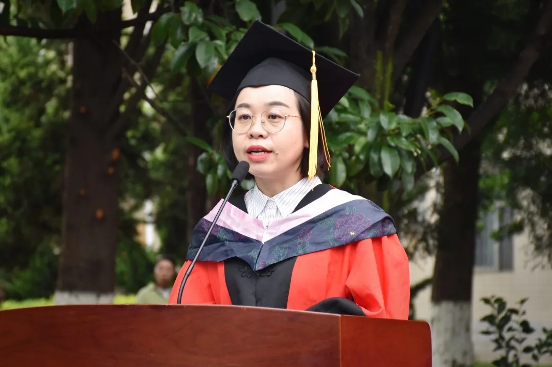 硕士毕业生代表韩敏同学分享了她七年的求学历程,在学院的悉心关怀和老师的谆谆教诲下,自己不懈奋斗、努力进取,顺利完成学业的同时还获得了国家奖学金,接下来她将为高职高专的教育事业做出自己的贡献。她坚信“心有所信,方能至远”,并深情地祝福母校春风化雨、广育英才。