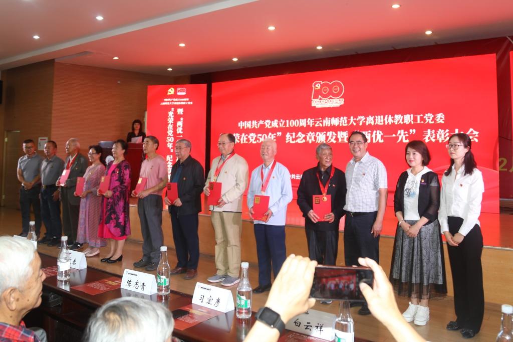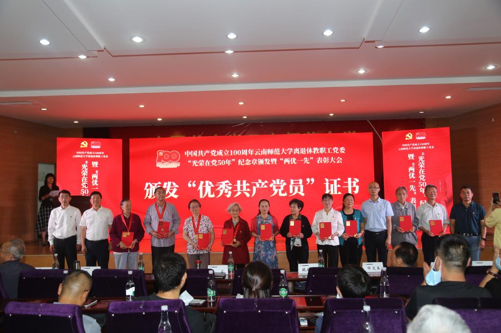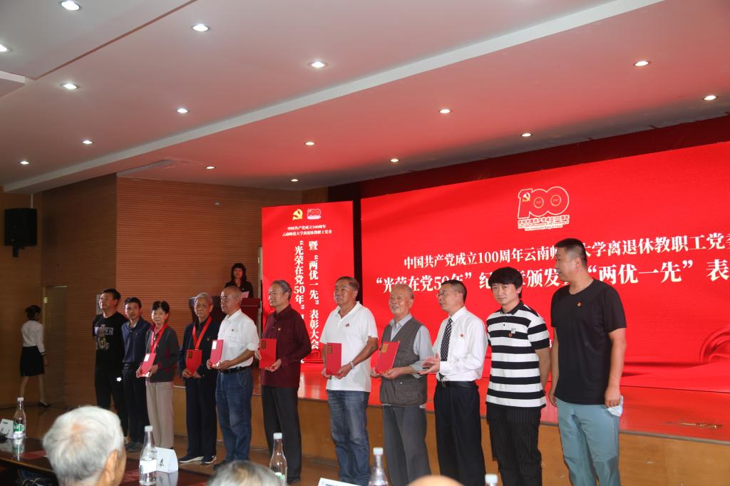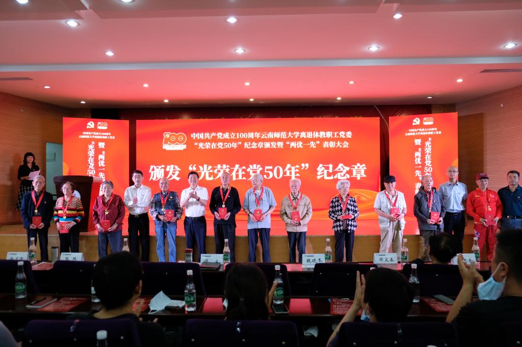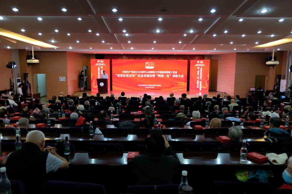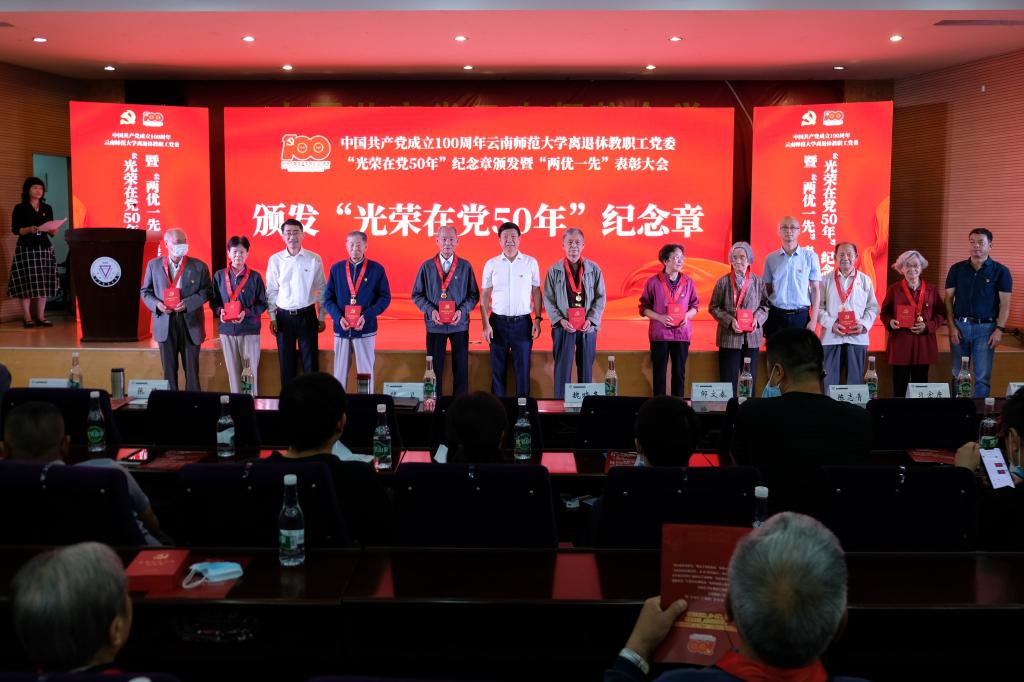 2021年6月28日上午,离退休教职工党委在西南联大校区田家炳教育书院二楼报告厅举行中国共产党成立100周年8858cc永利唯一官方网离退休教职工党委“光荣在党50年”纪念章颁发暨“两优一先”表彰大会。校党委书记饶卫、云南省老干部党校校长魏晓冬、校党委副书记张玮,学校离退休老领导,离退休工作领导小组成员单位及联大校区相关单位负责人,获得中共中央“光荣在党50年”纪念章的党员同志,受表彰的优秀共产党员、优秀党务工作者、先进党支部及离退休教职工党员代表等150余人参加会议。表彰大会由离退休教职工党委书记王琼玲同志主持。