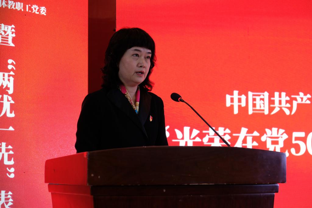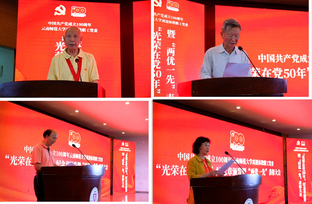 获得中共中央“光荣在党50年”纪念章党员代表张运贵同志、获得校党委表彰的优秀共产党员代表余嘉华同志、优秀党务工作者李保才同志、先进党支部代表齐婷同志分别作了发言。