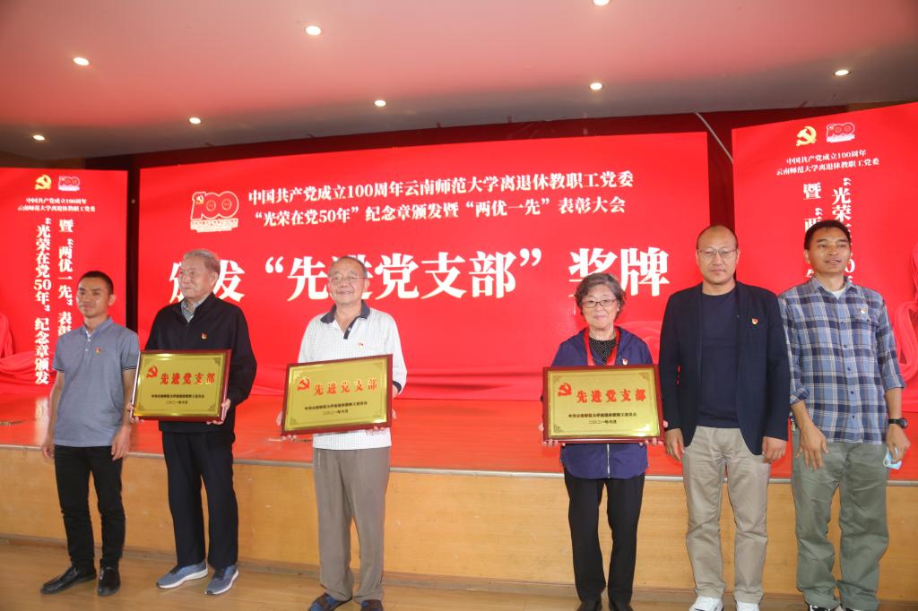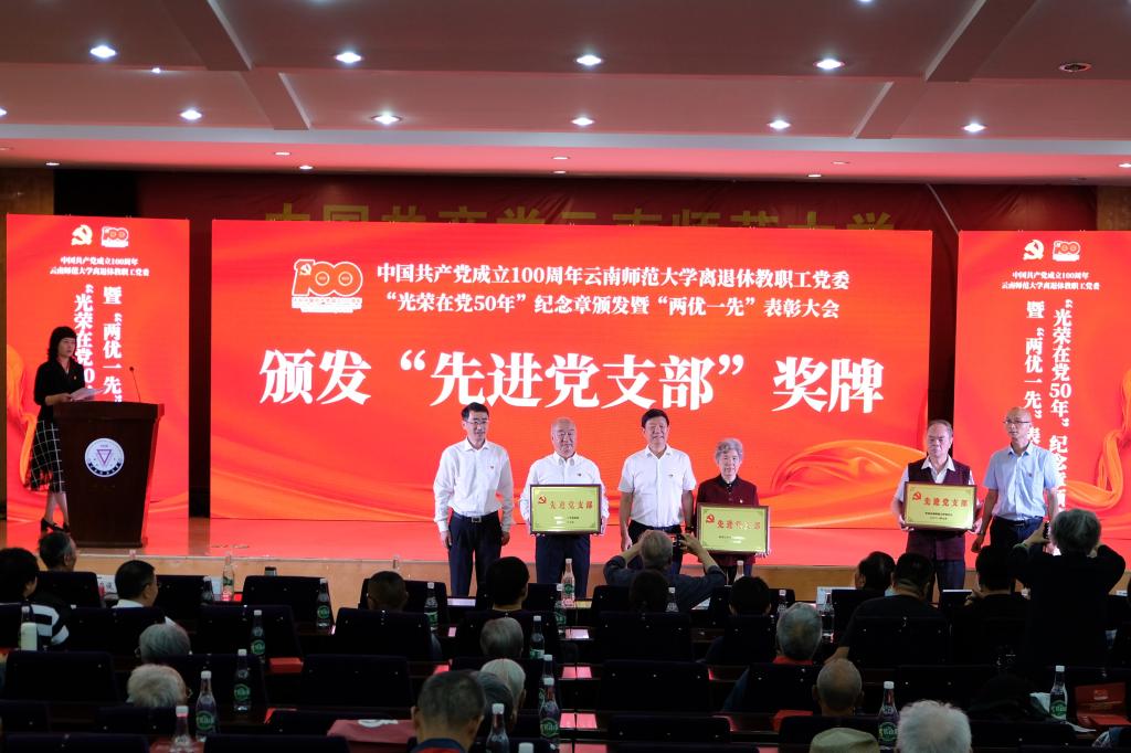 随后,校党委书记饶卫、云南省老干部党校校长魏晓冬、校党委副书记张玮等领导为到场获得中共中央“光荣在党50年”纪念章的每一位党员颁发纪念章,为获得校党委表彰的先进党支部、优秀共产党员、优秀党务工作者颁发奖牌和荣誉证书。离退休工作领导小组成员单位负责人为获得离退休教职工党委表彰的先进党支部、优秀共产党员、优秀党务工作者颁发奖牌和荣誉证书。