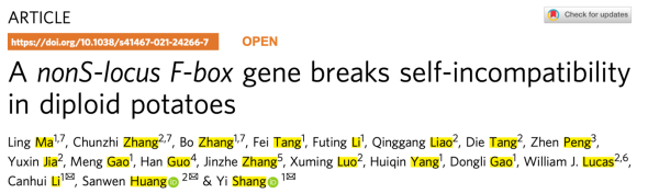 2021年7月6日下午17时,国际知名学术期刊《自然·通讯》(Nature Communications)在线报道永利官网马铃薯科学研究院尚轶研究团队发表的A non S-locus F-box gene breaks self-incompatibility in diploid potatoes 研究论文,介绍马铃薯自交亲和基因Sli (S-locusinhibitor)的克隆及功能解析。