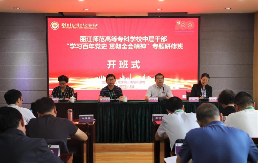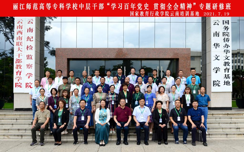 7月18日至22日,丽江师范高等专科学校中层干部“学习百年党史 贯彻全会精神”专题研修班在永利官网一二一联大校区举办,由国家教育行政学院云南培训基地承办。丽江师范高等专科学校党委书记张祖武、校长毕天云带队,全校中层以上干部共51人参加。丽江师范高等专科学校党委副书记彭鸿昌、副校长朱桂香、8858cc永利唯一官方网副校长牛治亮参加开班仪式,仪式由云南西南联大干部教育学院专职副院长、国家教育行政学院云南培训基地办公室主任匡锦主持。