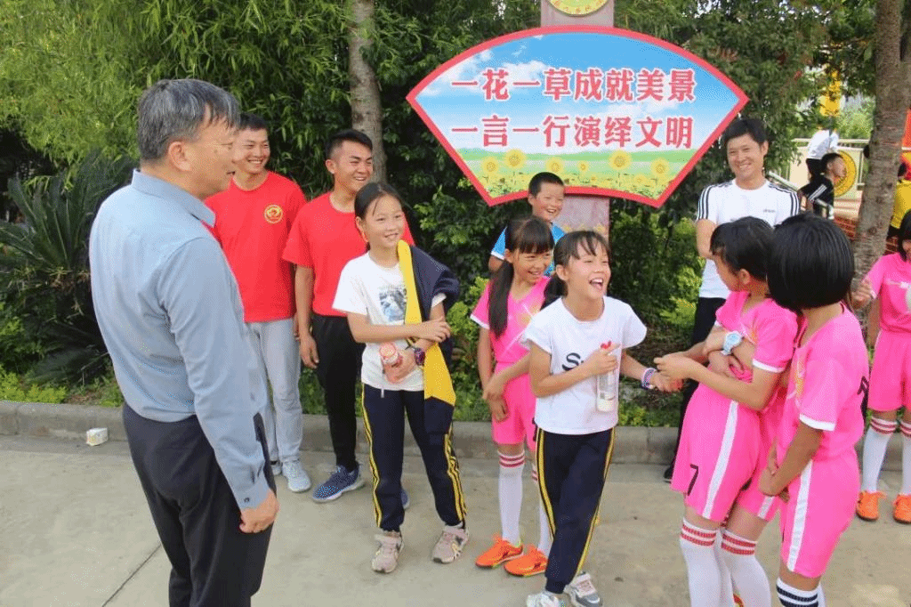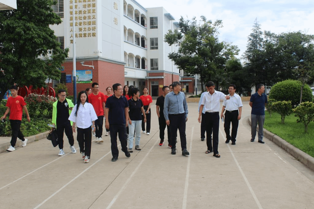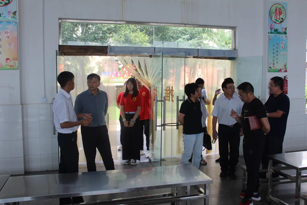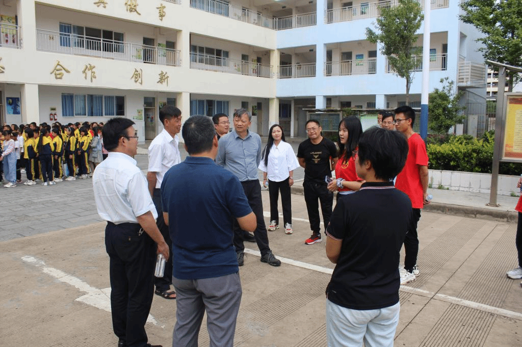 调研组一行来到九乡小学,在校长马怀云的带领下,参观了学校校园,深入查看了支教课堂、教学环境、运动区域、食堂卫生、宿舍条件等活动情况和保障措施。顶着炎炎烈日,李宏副书记、武友德副校长、蔡金红副校长与足球场上的支教团老师和学生们交流互动,观看他们的足球训练和比赛。紧接着,又参观了支教一年级向日葵班,与正在上课的一年级小同学们交流,看到支教团成员精心布置的教室后连连称赞。