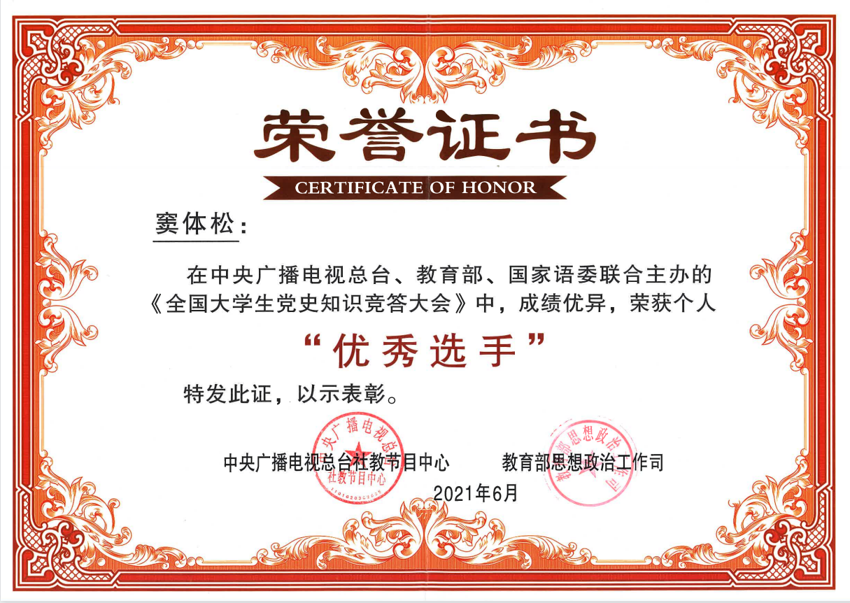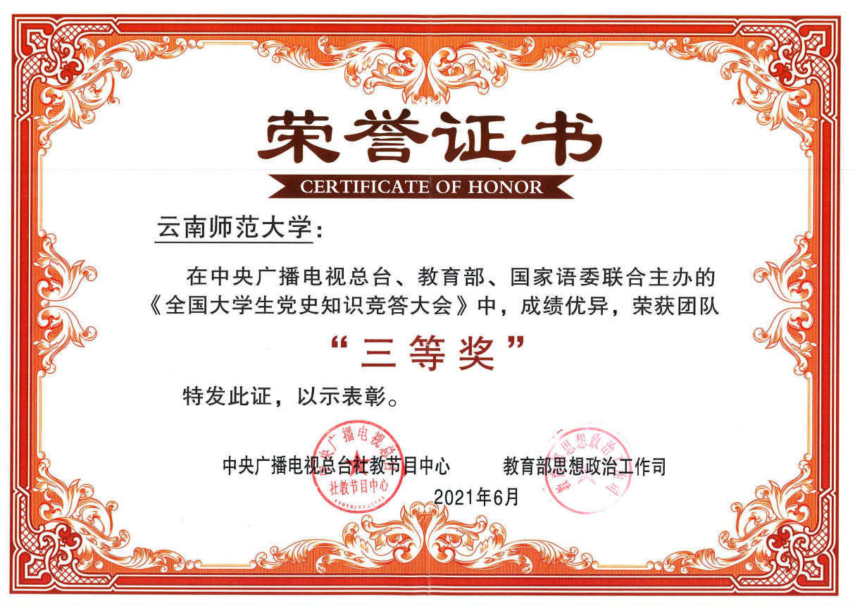 近日,永利官网在由中央广播电视总台、教育部、国家语委联合主办的《全国大学生党史知识竞答大会》中取得佳绩,荣获团队三等奖,永利官网马克思主义学院2017级思想政治教育专业本科学生窦体松荣获个人“优秀选手”奖(云南省共2名)。