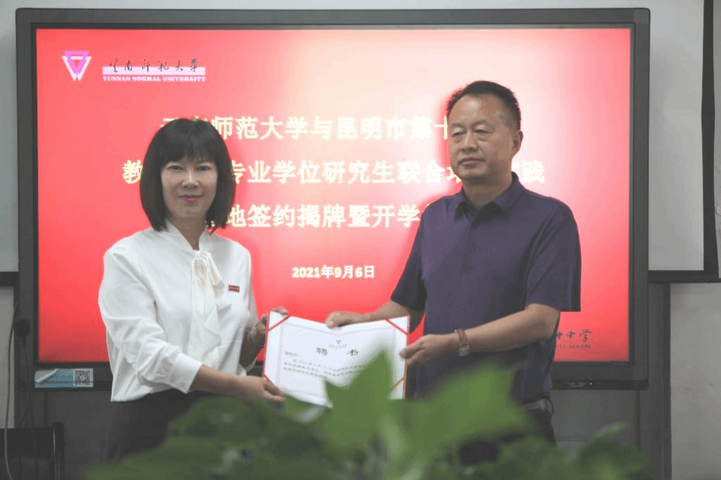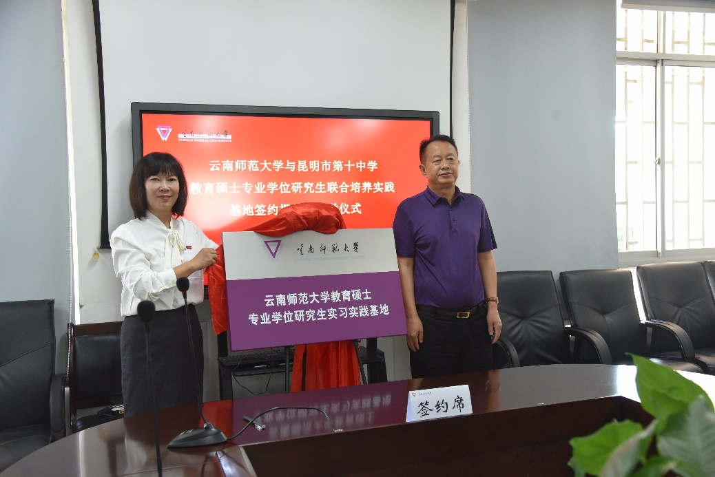 安学斌副校长与昆十中谢晓玲校长共同为“教育硕士专业学位研究生联合培养实践基地”揭牌,全体参会教师与教育硕士实习生合影留念。