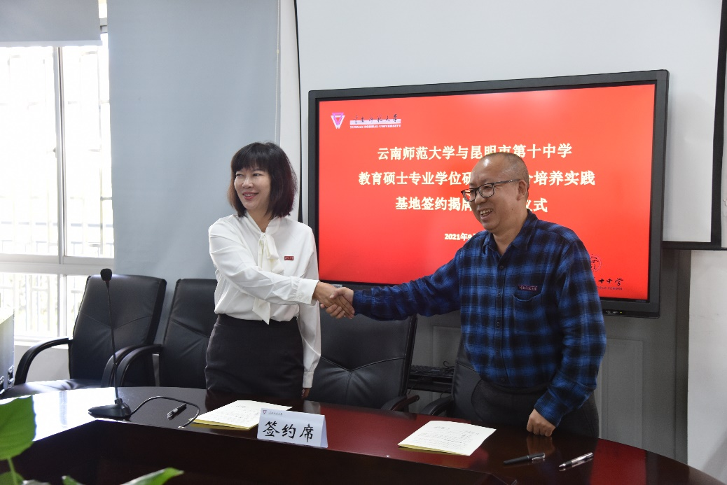 随后,研究生院骆华松院长和昆十中谢晓玲校长共同签署了《共建教育硕士专业学位研究生联合培养实践基地协议》。研究生院罗利佳副院长宣读昆明市第十中学谢晓玲等27名教师遴选为8858cc永利唯一官方网校外教育硕士专业学位研究生指导教师的决议,安学斌副校长为新遴选的导师代表颁发了聘书。