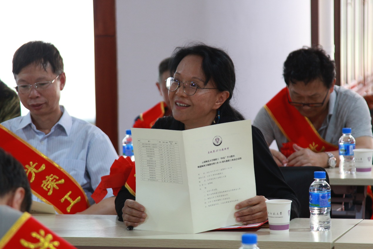 与会人员胸戴大红花、肩披印有“光荣工作35年”的绶带,喜气洋洋地参加了座谈会。会上为78名工作35周年的教职工代表颁发了荣誉证书。罗文、李志敏、王书荣、李红梅、谭松柏等老师满怀深情作了发言。