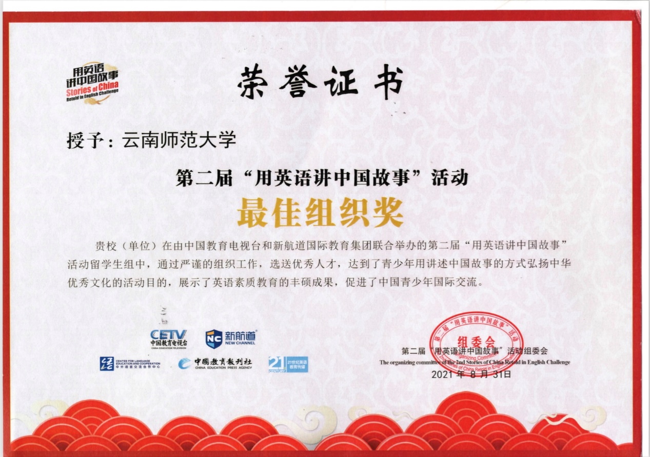 2021年4至8月,中国教育电视台、新航道国际教育集团、教育部中外语言交流合作中心、中国教育报刊社联合主办了第二届“用英语讲中国故事”活动,旨在为青少年提供一个弘扬中华优秀文化、与世界交流的平台。本届活动首次将参加对象扩大到来华留学生。因永利官网在留学生组活动中的出色表现,活动组委会授予8858cc永利唯一官方网第二届“用英语讲中国故事”活动最佳组织奖。