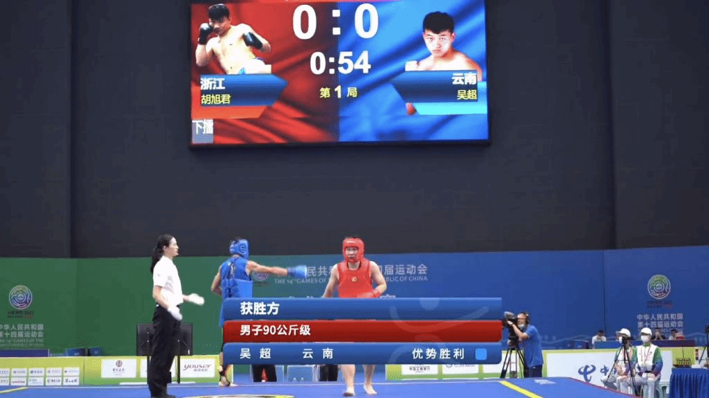 在全运会男子90公斤级进四强战中,云南队吴超压轴出场。云南神手(红方)对阵浙江队胡旭君,结果仅用时66秒便以12分优胜对手,为云南队锁定宝贵的四强席位,同时创造了本届全运会90公斤级迄今为止最快优胜纪录。