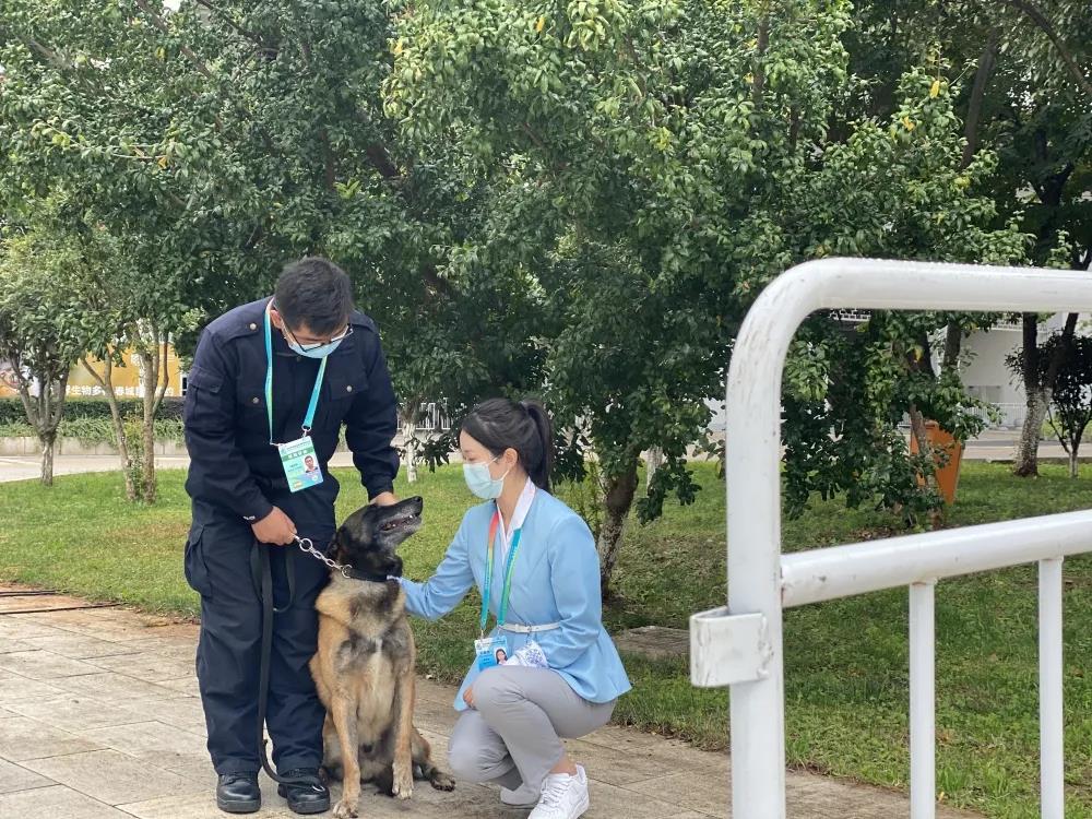 作为安检口翻译组的志愿者,邹洁主要负责配合特警、武警人员共同完成滇池会展中心二楼北天井口安检的翻译工作,以及为参会来宾送伞、引导指路等等。机灵可爱的警犬也备受志愿者们的喜爱。
