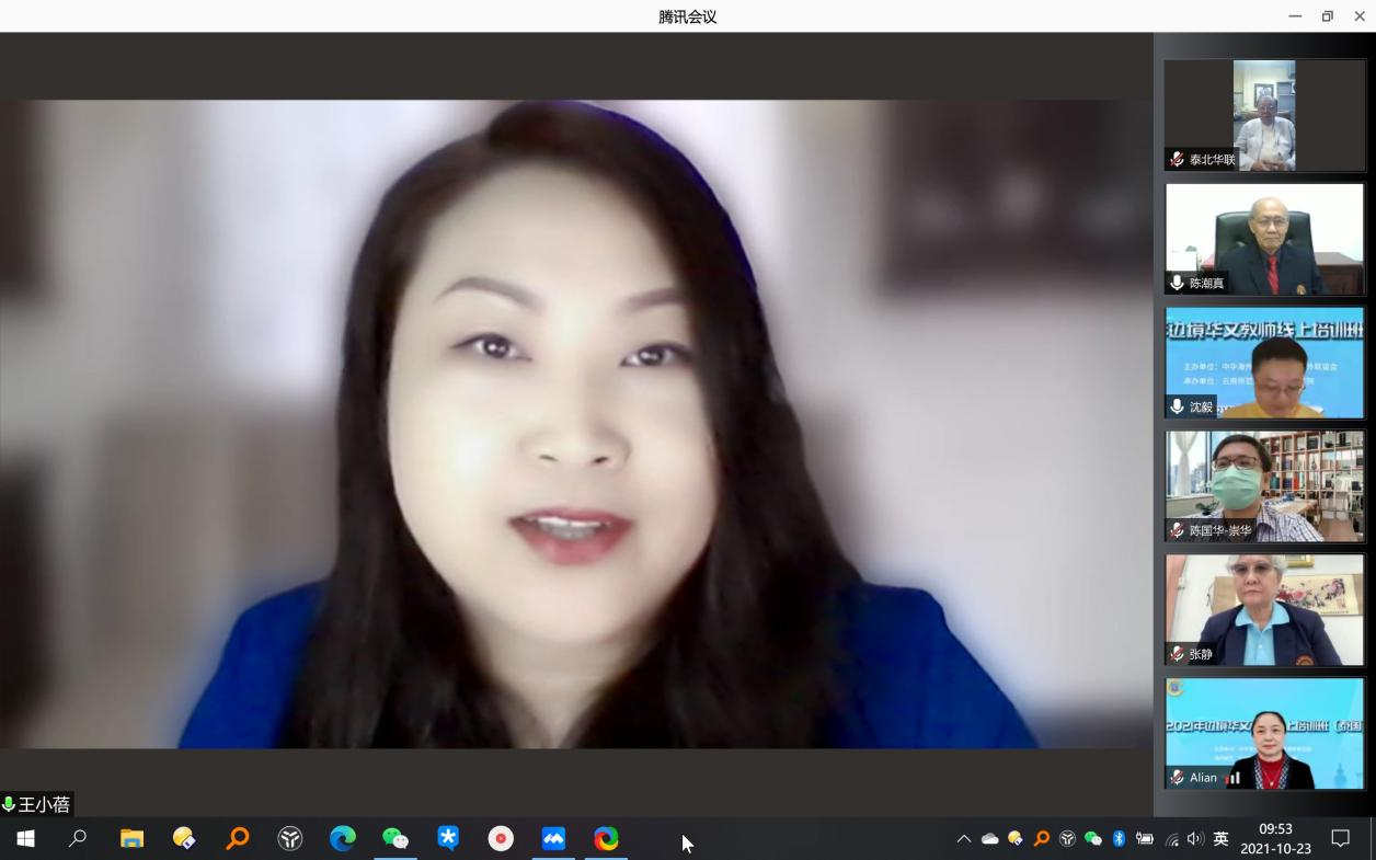 王小蓓老师作为泰国华文教师学员代表致辞。她向组织此次线上培训的云南华文学院表达了感谢,表示此次形式丰富的线上培训将会带给本土华文教师们“沉浸式”的培训体验,表达了在新挑战下不断学习的决心,将继续努力成为有“长流水”的华文教师。
