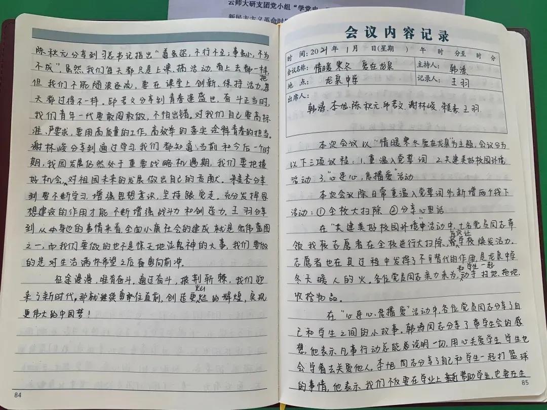 云师研支团于2015年成立临时党支部(2018年9月调整为党小组),定期开展组织生活,切实将党建工作与支教服务工作相结合,在教育扶贫、志愿服务及公益活动等方面取得了丰硕成果,得到了龙泉中学师生的一致肯定。研支团的优秀事迹被云南省委教育工委选为“创建一流党建示范项目”,研支团被共青团云南省委、云南省青年联合会授予“云南青年五四奖章集体”称号,被昭通团市委授予“乌蒙青年组织先锋”荣誉称号。