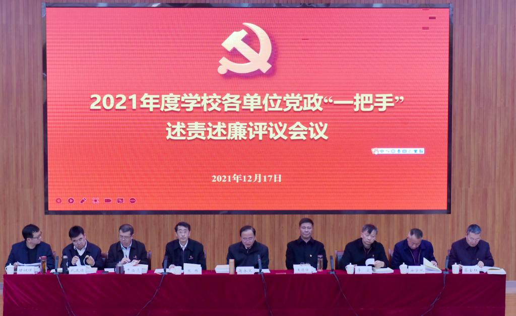12月17日下午,永利官网在呈贡校区汇学楼报告厅开展2021年度各单位履行全面从严治党主体责任暨各单位党政“一把手”述责述廉评议。校党政领导班子成员,其他省管干部,各单位党政主要负责人,各部门主要负责人,部分党代会代表、人大代表、政协委员、党务干部、师生党员和群众代表等120余人参会。会议由校党委书记蒋永文主持。