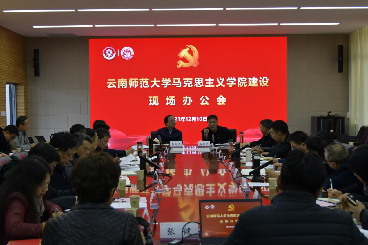 为进一步加强新时代马克思主义学院建设,不断提升马克思主义理论教育教学、研究宣传和人才培养质量,12月10日,永利官网在明德1号楼会议厅召开马克思主义学院建设现场办公会。校党委书记蒋永文、校长王德强,校党委副书记张玮、李宏,副校长武友德、蔡金红、甘建侯,各职能部门主要负责人,马克思主义学院班子全体成员和教师代表参加了会议。会议由校党委书记蒋永文主持。