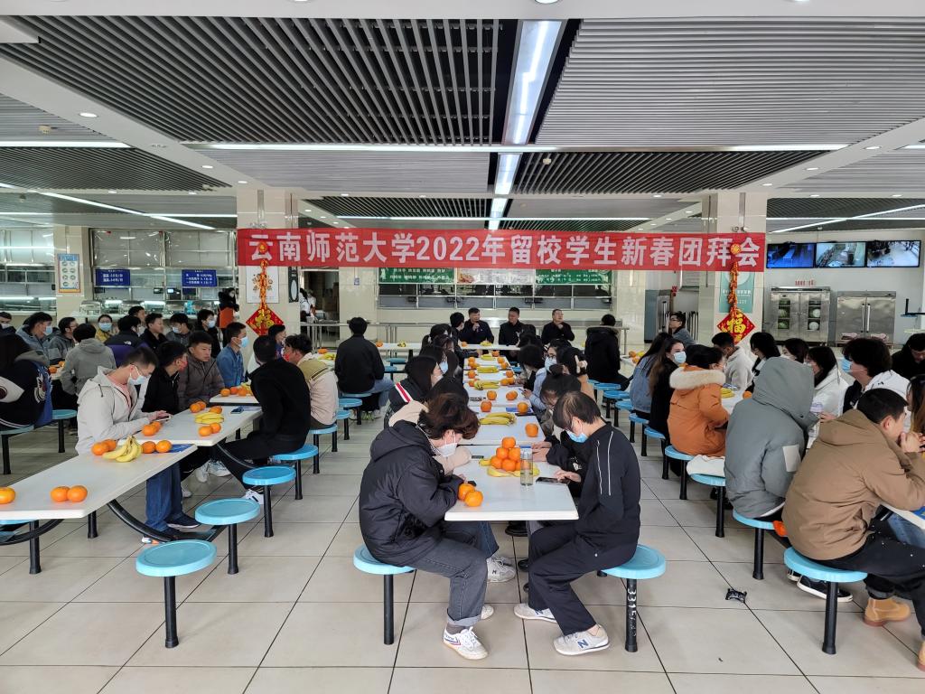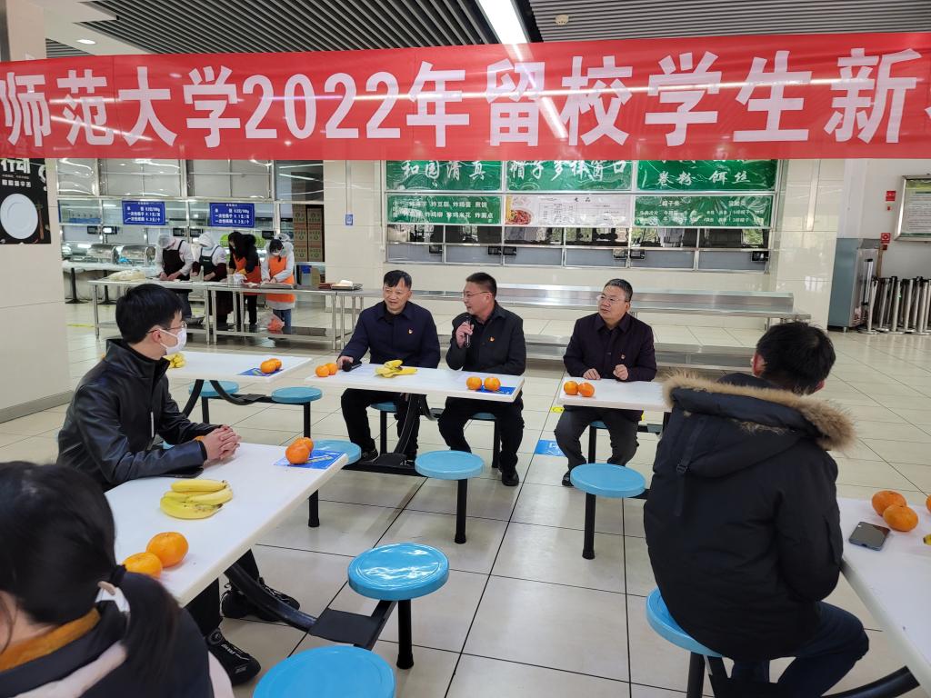 2022年春节将至,1月31日上午,8858cc永利唯一官方网2022年新春团拜会在东区食堂举行。校长王德强、党委副书记李宏、副校长蔡金红、各学院值班领导与80多名留校学生一起共度新春佳节。