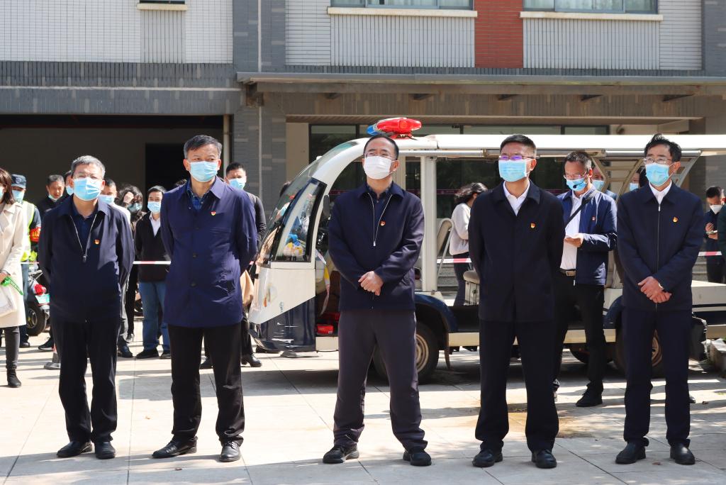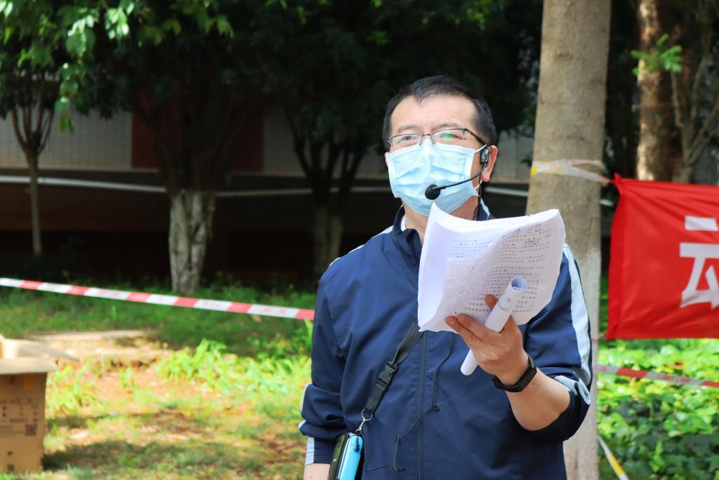 下午3点30分,牛治亮副校长宣布演练正式开始。本次演练共设置两个演练场景。第一个演练场景在东区10栋宿舍门前,校医院接到有一名培训学员为次密切接触者的信息后,立即向属地疾控中心联系并将此情况告知学校疫情防控办,并配合属地疫情指挥部派出的转运车辆将该学员转运出学校。校防控办领导现场指挥,统筹协调校医院、保卫处、后勤保障服务中心、心理健康中心、万名校长培训项目办等相关单位,引导该生的同学和舍友有序至校医院核酸采样点进行核酸采样,对学员宿舍进行消毒,并做好留观师生的后续服务等工作。