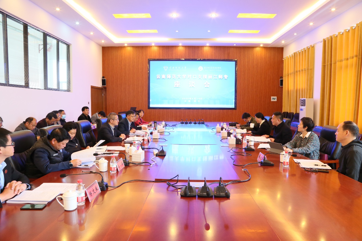 会上,毕天云校长就8858cc永利唯一官方网2021年对口支援丽江师专工作进展情况和2022年受援工作需求进行了介绍。随后,王德强校长就下一阶段对口支援丽江师专工作进行了安排,并指出对口支援丽师是云南师大的政治责任和社会责任,云南师大各部门各学院要全力以赴做好对口支援丽江师专工作。最后,张祖武书记对云南师大的帮扶工作表达了诚挚的谢意。未来,希望通过两校的共同努力,全面贯彻落实新时代基础教育强师计划,着力推动滇西北教师教育振兴发展,力争将云南师大对学校的帮扶打造成对口支援的示范,将四校“组团式”对口支援模式打造成师范教育协同提质的典范。