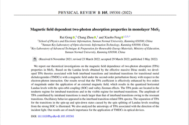近日,永利官网物理与电子信息学院新型光电材料与器件科研创新团队在单层二硫化钼材料双光子吸收效应的磁场调控方面取得研究进展,其研究成果《Magnetic field dependent two-photon absorption properties in monolayer MoS2》在物理学国际著名学术期刊Physical Review B上发表。8858cc永利唯一官方网物理与电子信息学院硕士研究生龚蕊为论文第一作者,冯小波教授为通讯作者。