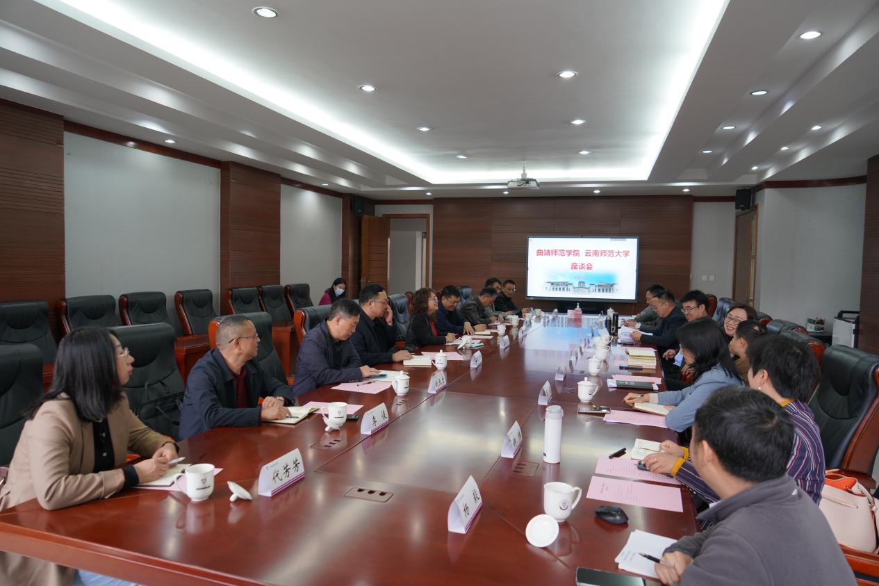 2022年5月17日上午,曲靖师范学院党委委员、副校长郭丽红及相关部门负责人一行9人到永利官网考察交流。双方在呈贡校区行政楼341会议室举行交流座谈会,永利官网武友德副校长、郝淑美副校长,教务处、人事处、学生处、对外合作交流处、科技处、教学质量监控与评估中心等部门负责人参加座谈会。座谈会由武友德副校长主持。
