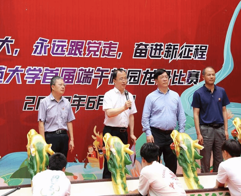 “点睛仪式”是龙舟比赛的传统仪式,校党委书记蒋永文、副校长蔡金红、体育学院党委书记华致雄、刘坚教授共同为龙点睛。