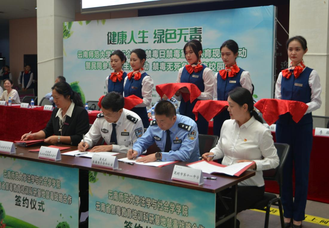 活动现场,永利官网法学与社会学学院与云南省第五强制隔离戒毒所、昆明市盘龙区禁毒委员会办公室、昆明市第十一中学、云南省女子强制隔离戒毒所签订了禁毒教育实践基地合作协议,并举行授牌仪式。云南省第五强制隔离戒毒所的民警为学校师生讲解禁毒知识,展示仿真毒品模型,到场的师生和民警参观了学校各学院(学部)禁毒防艾教育成果展及学生禁毒书画展。