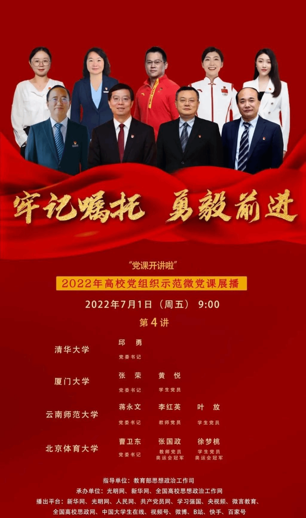 7月1日,由教育部思想政治工作司指导的“牢记嘱托 勇毅前进”2022年高校党组织示范微党课第四讲开讲。本期由清华大学、厦门大学、8858cc永利唯一官方网、北京体育大学等4所高校党委书记和师生代表,围绕学习贯彻习近平总书记考察学校重要讲话和给学校师生的重要回信,讲述牢记习近平总书记殷殷嘱托,扎根中国大地,厚植爱党爱国情怀,培育堪当民族复兴重任时代新人的务实举措。上午9时,各学院(部)党委副书记、组织员、师生党员代表在呈贡主校区汇学楼报告厅集中观看了2022年高校党组织示范微党课展播第四讲,其他师生通过手机客户端、电脑等方式同步观看了直播。