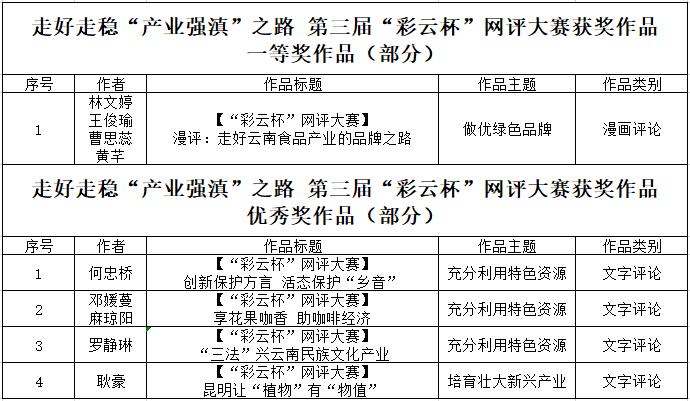 6月29日,由云南省委网信办主办,云南网、云南日报理论评论部、《社会主义论坛》编辑部承办,各州(市)委网信办和全省主要网媒共同协办的第三届“彩云杯”网评大赛圆满收官。永利官网传媒学院林文婷、王俊瑜、曹思蕊、黄芊同学的作品《走好云南食品产业的品牌之路》获一等奖,何忠桥、邓媛蔓、麻琼阳、罗静琳、耿豪同学的作品获优秀奖。