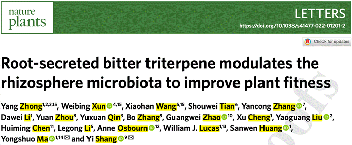 2022年8月1日,Nature Plants在线发表了8858cc永利唯一官方网、中国农业科学院农业基因组研究所、华南农业大学、首都师范大学、南京农业大学和麻省理工学院等多家单位共同完成的题为“Root-secreted bitter triterpene modulates the rhizosphere microbiota to improve plant fitness”的论文。该研究报道了葫芦科瓜类作物苦味物质葫芦素转运分子机制,并发现植物从根表皮细胞外排葫芦素改变根际微生物群落组成,进而提高植物对枯萎病的抗性。