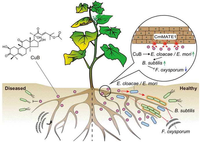 在明确植物通过CmMATE1/ClMATE1外排葫芦素B/E至根际土壤的基础上,团队通过分析了根际微生物16S rRNA及宏基因组测序数据,发现甜瓜根系分泌葫芦素B可招募特定的根际菌群并增强植物的抗病性。进一步通过分离土壤根际微生物及体外实验,团队发现葫芦素B可促进根际肠杆菌生长,解除了葫芦素B对根际典型拮抗细菌——芽孢杆菌的抑制作用,从而提高了根际芽孢杆菌丰度,并建立了甜瓜对土传病原菌——镰刀菌的有效防御。本研究为植物天然产物转运机制研究以及转运蛋白如何调控植物根际微生物组提供了新的见解。