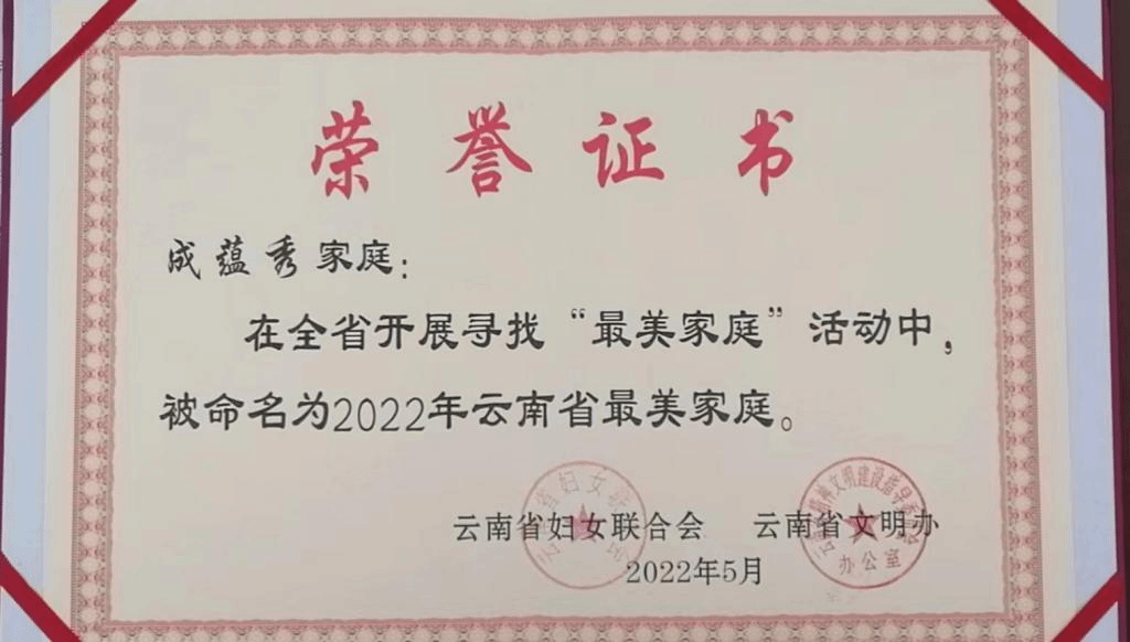 在2022年6月15日举办的“好家风传万家——2022年云南省最美家庭揭晓仪式暨家风好故事主题宣讲活动”上,省委宣传部、省妇联、省文明办共同揭晓100户云南省最美家庭。永利官网生命科学学院成蕴秀家庭入选2022年云南省“最美家庭”称号。