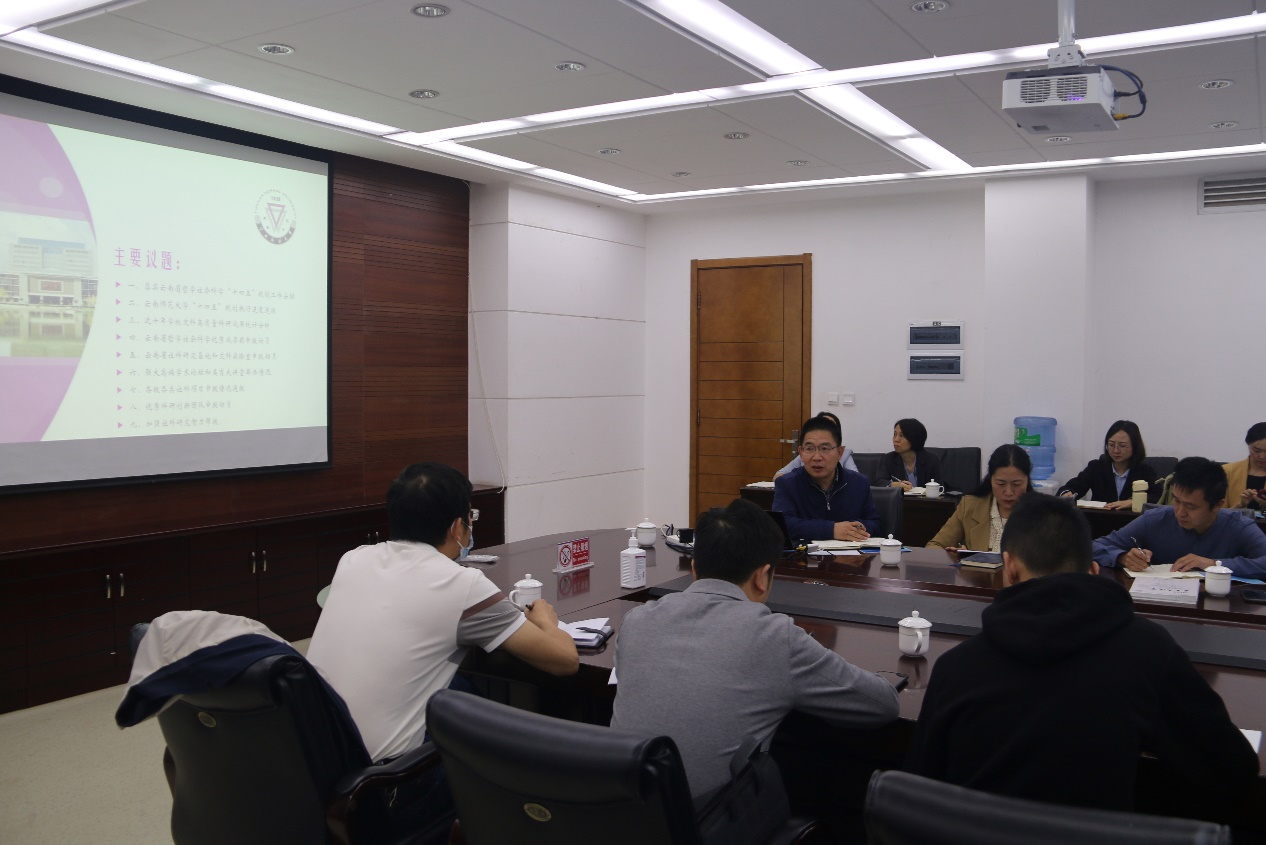会议内容涵盖了落实云南省“十四五”时期哲学社会科学发展规划工作安排、8858cc永利唯一官方网“十四五”规划执行进度情况、近十年学校文科高质量科研成果统计分析情况、云南省社会科学奖申报动员、云南省社科研究基地和文科实验室申报动员、联大高端学术论坛和美育大讲堂举办情况、各级各类社科项目申报情况通报、优秀科研创新团队申报动员、加强社科研究智力帮扶等九项主要议题,各学院领导就相关议题做了充分交流。