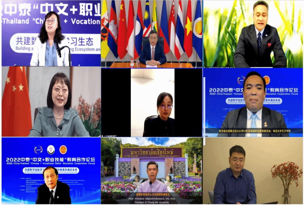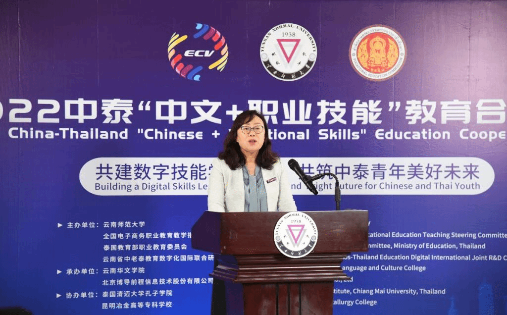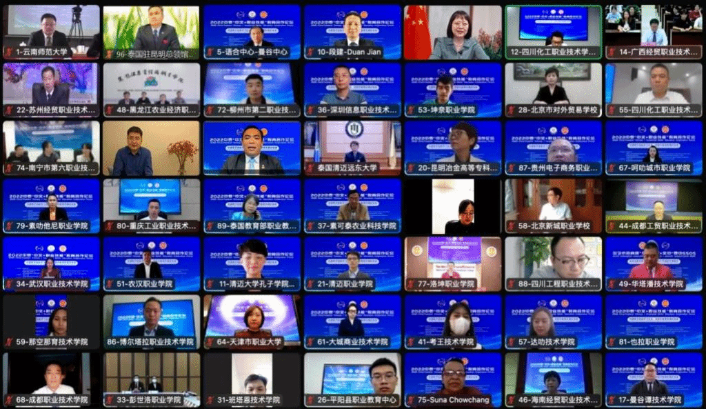 史忠俊表示,中泰合作“中文+职业技能”项目有机整合双方政策、人才、技术、市场等多重要素资源,构建集标准开发、课程建设、实践服务、创新创业于一体的国际化数字技能人才培养发展体系,通过产教融合国际化合作,推动中泰职业教育合作迈上新台阶;孟功指出,中泰关系愈加紧密,极大带动了泰国对“中文+职业技能”人才的需求;冯俊英表示,“中文+职业技能”将打造出集中文学习、技能实践、创业孵化三位一体的人才培养模式,希望项目能继续深化中泰两国人民的友谊,为促进民心相通做出更多贡献,取得更好的成效;王源表示,云南省教育厅愿携手中泰职业院校、企业,搭建互惠共赢、交流互鉴的平台,促进双方职业院校全方位多层次的合作,打造职业教育双向交流合作的平台;尼迪·纳齐、彭拉表示,泰国职教委、清迈大学将竭诚参与“中文+职业技术”项目,携手构建后疫情时代职教交流合作长效机制,提升泰方院校职业技能领域国际化办学水平和核心竞争力;赵燕清表示,语合中心曼谷中心将致力支持和推动中泰“中文+职业技能”教育向更深层次发展,期待携手中泰院校共同推进相关项目,完善各类标准建设;陆春阳向与会者介绍了“以技能合作共兴数字经济,青年创业共振经济活力,文化互鉴共享美好生活”为合作愿景的一带一路“电商谷”国际合作项目。