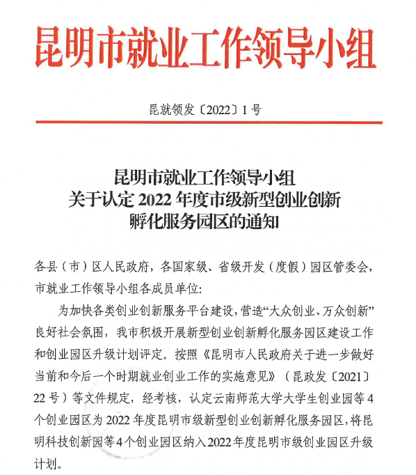 9月15日,昆明市就业工作领导小组发布《昆明市就业工作领导小组关于认定2022年度市级新型创业创新孵化园区的通知》,云南师范大学大学生创业园被认定为2022年度市级新型创业创新孵化园区,是2022年昆明市获此认定的唯一高校。获此殊荣不仅是对永利官网学生创业工作的高度肯定,也是学生创业园建设和发展过程中的重要机遇。