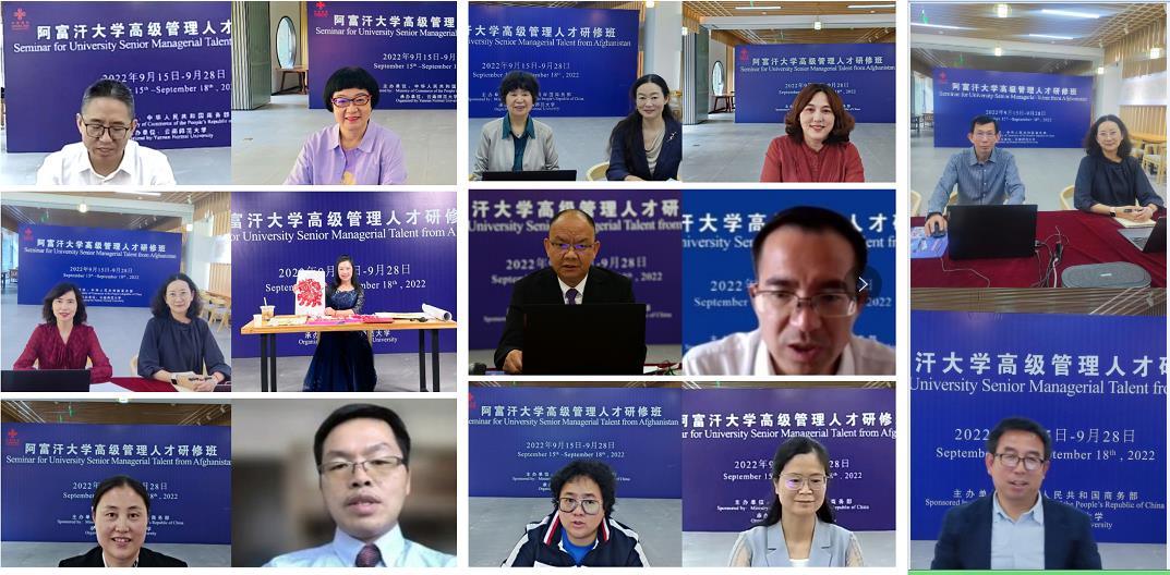 研修班为期14天,学员来自阿富汗高教部、喀布尔大学、喀布尔理工大学、喀布尔师范大学、喀布尔医科大学的教育官员、校长、骨干教师,共25人。为了应对疫情带来的影响,本着“主办方满意,主管单位满意,参与方满意”“三满意”的原则,永利官网精心筹备设计,积极整合资源,采用了线上“云研修”模式,联合教育学部、职教等学院的优秀师资安排了专题讲座、专题研讨及文化体验。在授课专家、专职管理人员、翻译人员和保障队伍的共同努力下,克服阻力和困难,顺利地完成了各项研修活动。