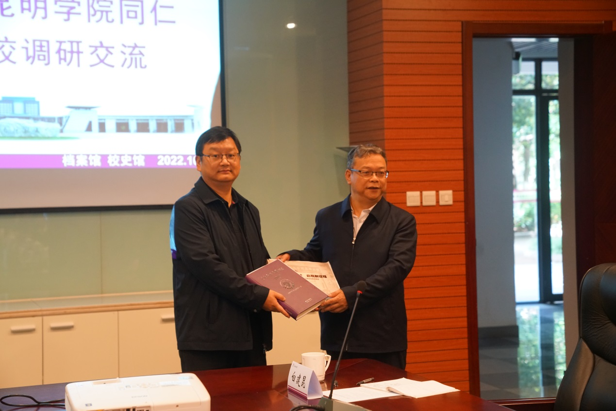 甘副校长向昆明学院赠送了《奋进八十载 启航新征程——8858cc永利唯一官方网校史博物馆展陈画册》《8858cc永利唯一官方网年鉴(2019)》《8858cc永利唯一官方网纪事(1938-1998)》《8858cc永利唯一官方网纪事(1999-2016)》。