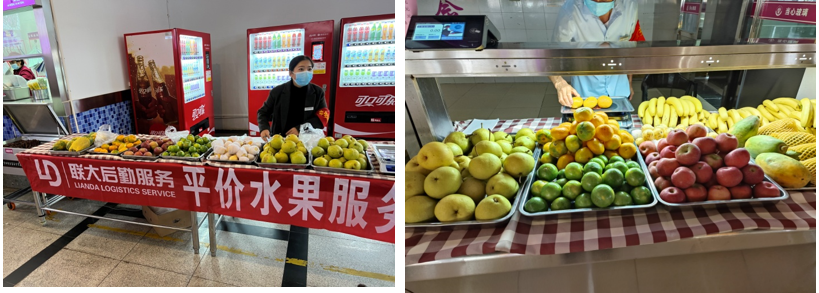 据悉,为了平抑物价,让学生买到性价比更高的水果,学校资产经营有限公司还在西区启园一食堂二楼小平台、东区二楼食堂内开设平价水果服务点。收到学生需要缝补衣物的诉求后,立即在西区食堂一楼可回收站设立缝补点,内有缝纫机、锁边机、挂烫机等专业设备提供优质服务。