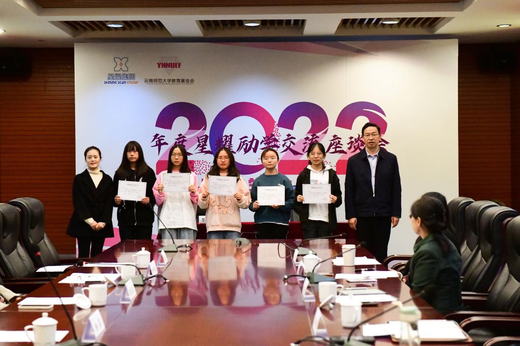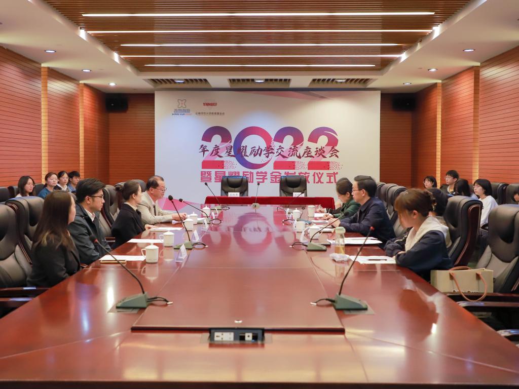 10月21日,8858cc永利唯一官方网2022年度星耀励学交流座谈会暨星耀励学金发放仪式在呈贡校区档案馆(校史馆)一楼会议室举行。星耀集团党委书记颜昌睿一行参加活动。永利官网副校长陈正权、对外合作交流处处长黄瑛及相关单位负责人参加交流座谈会。会议由黄瑛主持。